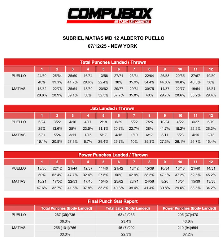 Aunque Puello mostró un boxeo técnico, movilidad y recursos durante los 12 asaltos, Matías impuso un ritmo incansable y aumentó su volumen de golpeo conforme avanzaba el combate.